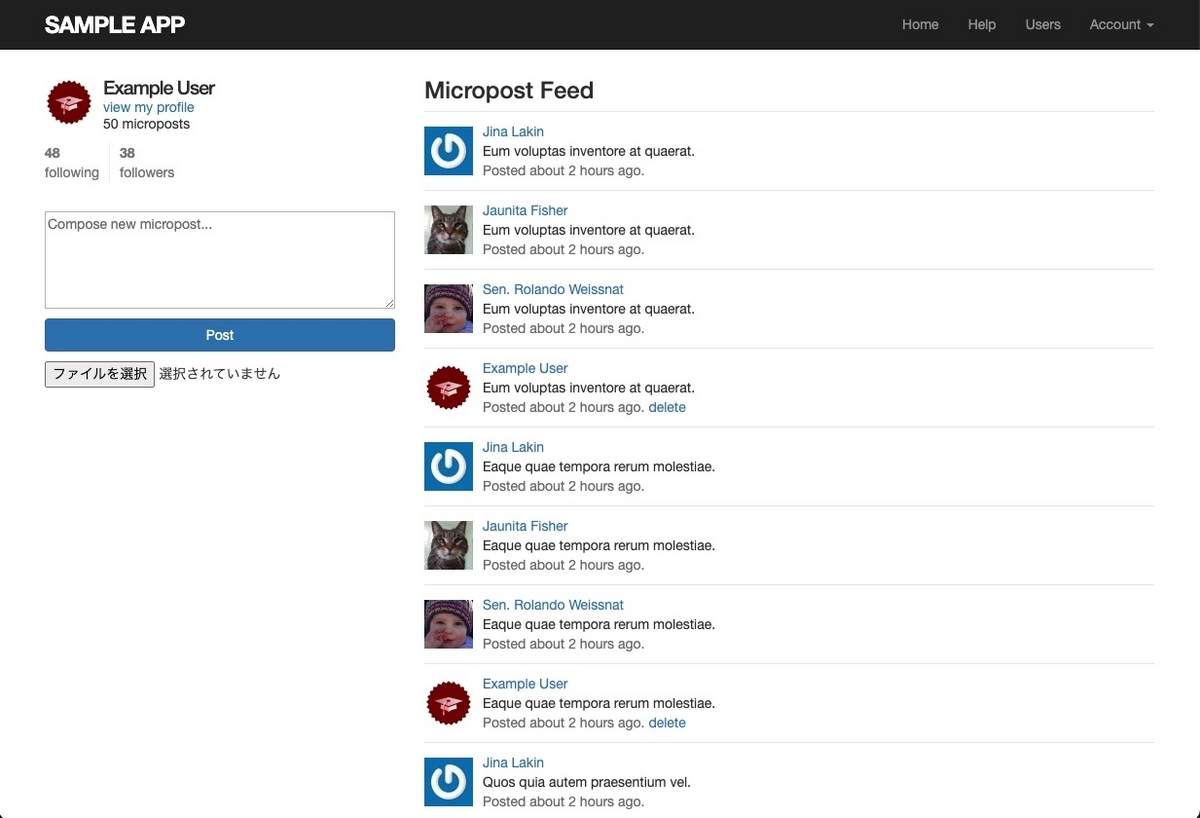 Railsチュートリアルの続きです。前回は7〜10章まで進み、データベースのユーザーのモデルを作成を行いました。その後、ついに最終章の14章まで完走しました!ユーザー登録、ポスト投稿、フォローなどの機能を追加して、Sampleアプリケーションが完成しました!それではいきましょう!